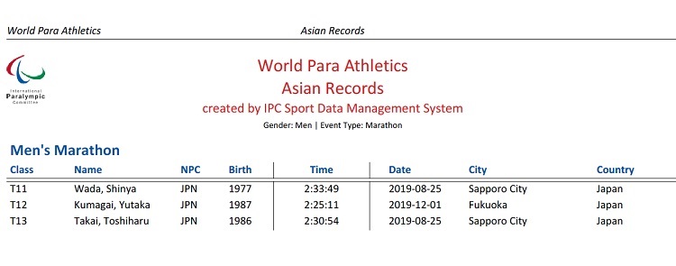 ブラインドの男子マラソンのアジア記録は2019年、3つのクラス全てが記録更新されました。