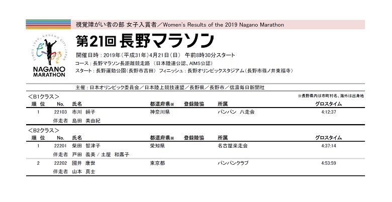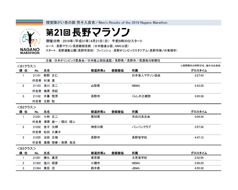 4月22日、第21回長野マラソンが行われました。視覚障がい者の部の入賞者の結果をお知らせします。