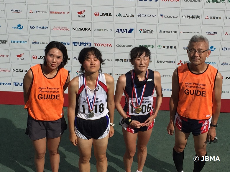 写真:T11女子5000mの表彰式。左から日野ガイド、井内選手、アジア記録更新の金野選手、松浦ガイド