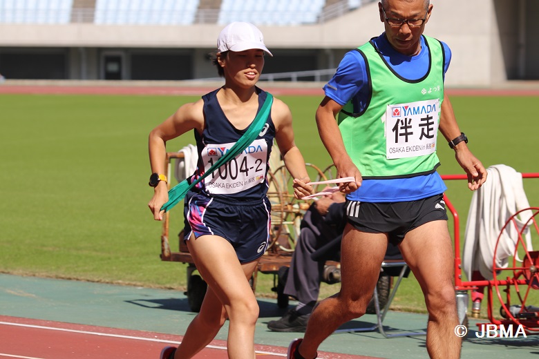 画像1:加治佐選手、北村ガイドから2区 梶木選手へのたすき渡し