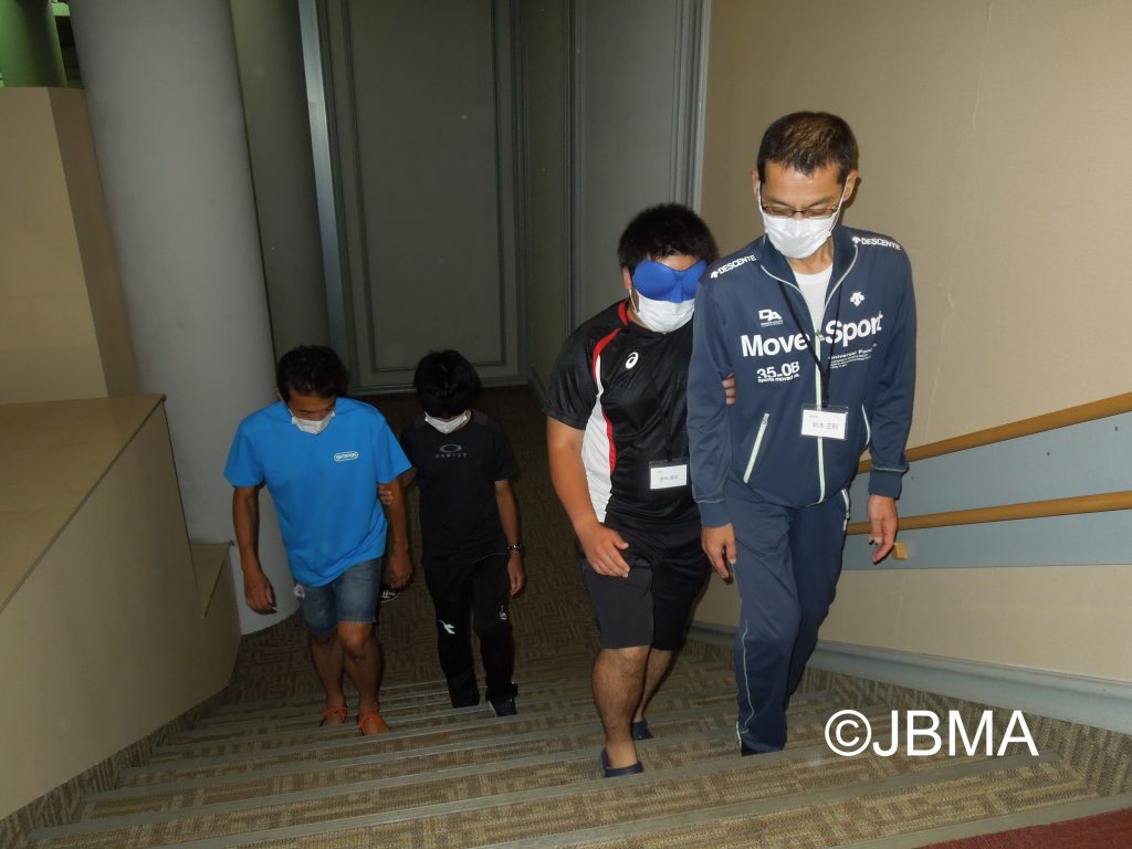 施設内でアイマスク体験と介助の実技 2日目は、晴れました!