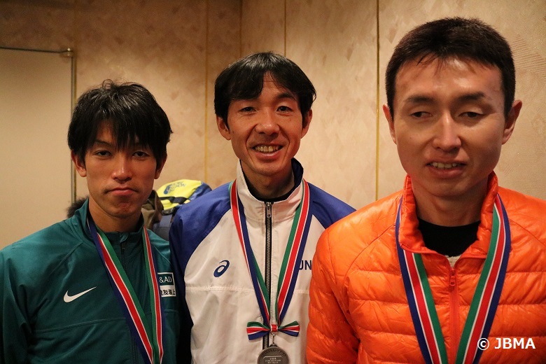 写真:表彰式後の男子Top3.左から熊谷選手、岡村選手、和田選手