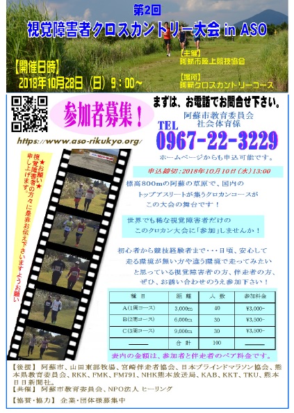 このような状況の中、主催者(阿蘇市陸上競技協会)としては、視覚障害者の活動の場を広げ、 障害者の競技力向上及び障害者スポーツへの関心を高め、より一層住み良い社会になるよう貢献したいと考えております。