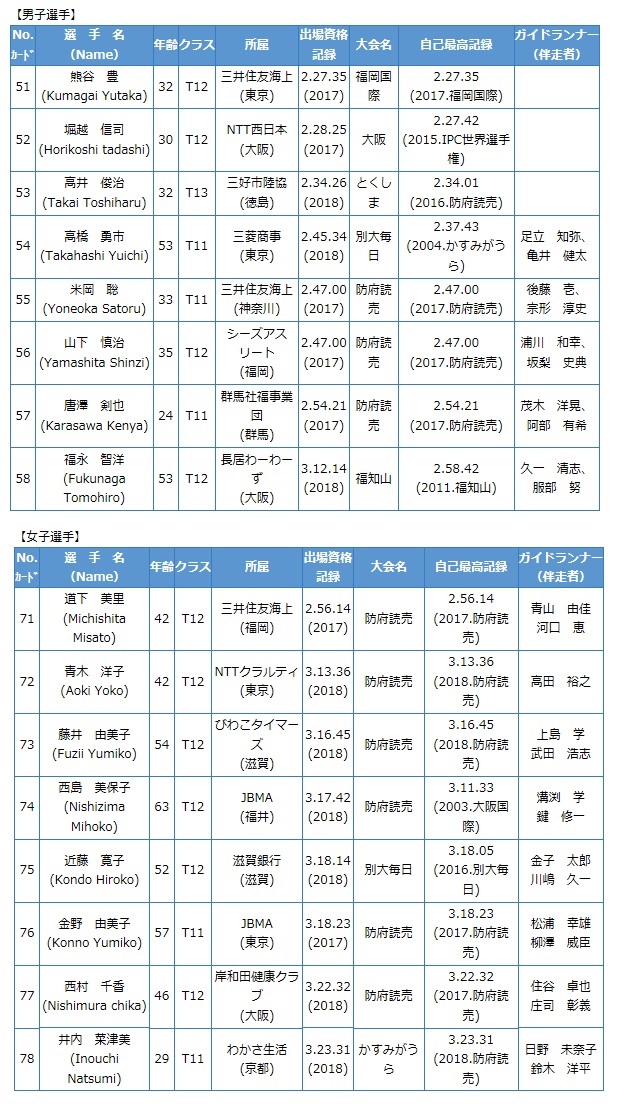 2月3日に行われる別府大分毎日マラソンに参加する、IPC登録の視覚障がい選手のエントリーリストです。