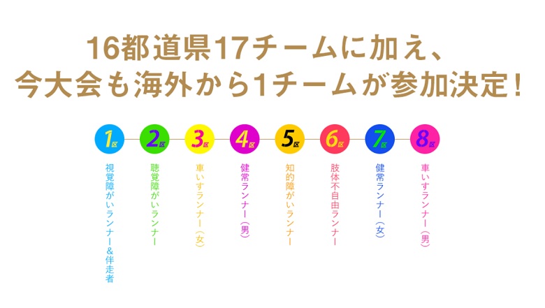 視覚障がい者が1区を務め、以降2区から8区までは聴覚障がい、車いす女子、健常者男子、知的障がい、肢体不自由、健常者女子、車いす男子とタスキが繋がれていきます。