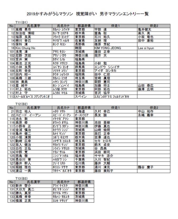 | No | 氏名漢字 | 氏名カナ | 都道府県 | 伴走1 | 伴走2 |
