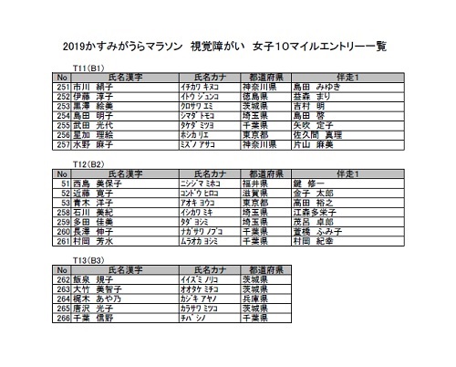 | No | 氏名漢字 | 氏名カナ | 都道府県 | 伴走1 |