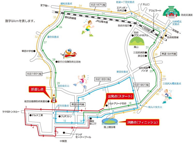 スタート地点が従来の陸上競技場内から、ソルトアリーナ防府前 県道58号線からのスタートに変更となります。