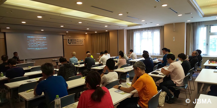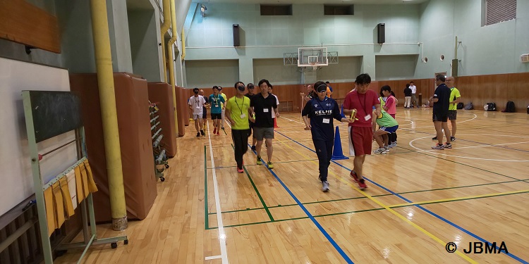 台風による天候の不安もありましたが、視覚障がいランナー5名を含む、27名が伴走理論や伴走規則の講義、体育館での伴走実技体験に熱心に取り組みました。