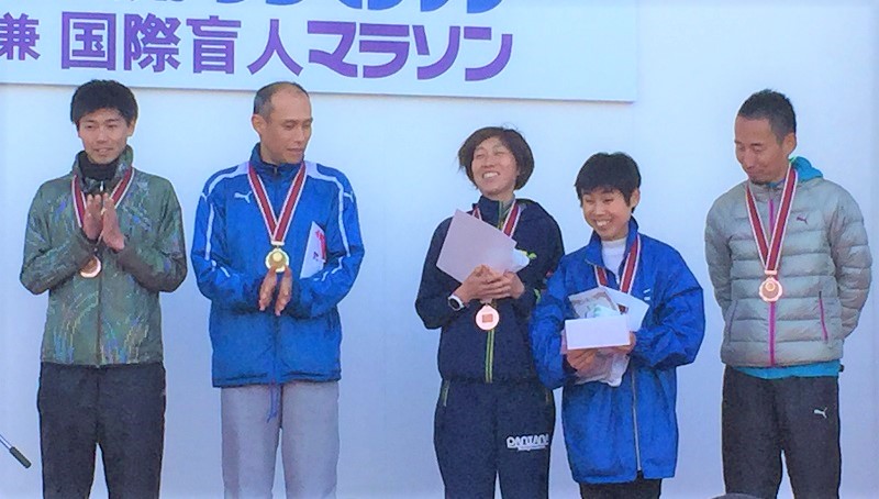 写真は2016年大会のマラソンで優勝した男子の池永敦さんと女子の安部直美さんの表彰式。左から池永さんの伴走者の西川さん、池永さん、安部さんの伴走者の成田さん、安部さん、伴走者の藤原さんの5名。