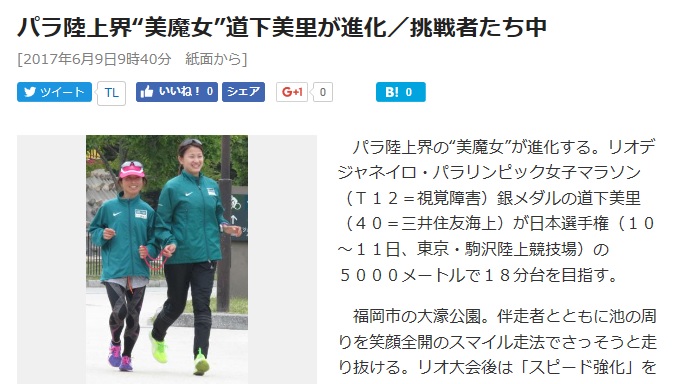日刊スポーツの「挑戦者たち」に道下美里選手が紹介されました。
