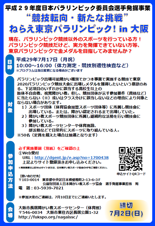 東京2020パラリンピック競技大会でメダル獲得の可能性のある有望アスリートを発掘することを目的として日本障がい者スポーツ協会日本パラリンピック委員会(JPC)が主催する選手発掘イベントが7月17日(月曜)に大阪府大阪市長居障がい者スポーツセンターを会場として開催されます。