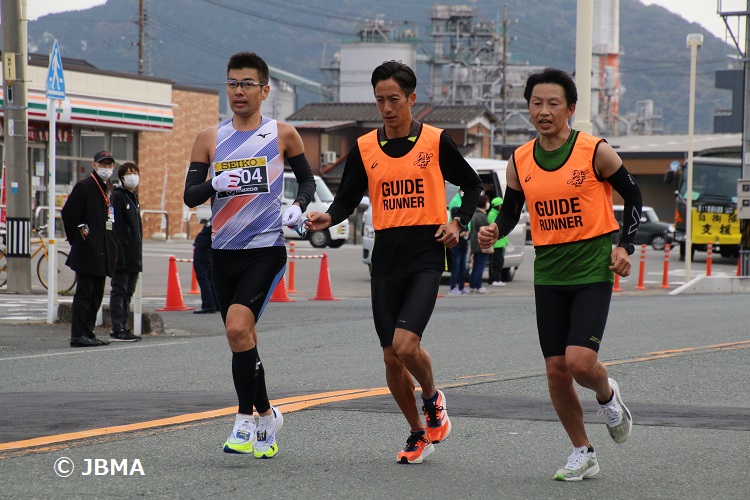 写真1:伴走者交代直後の山下選手、山領ガイド(後半)、吉川ガイド(前半)