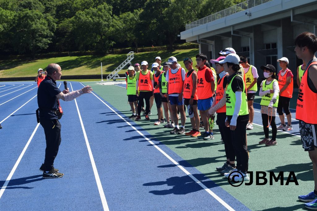 当日は、総勢54名の参加があり、希望ヶ丘公園のスポーツ会館会議室と陸上競技場において、伴走に関する講義と実技が行われました。