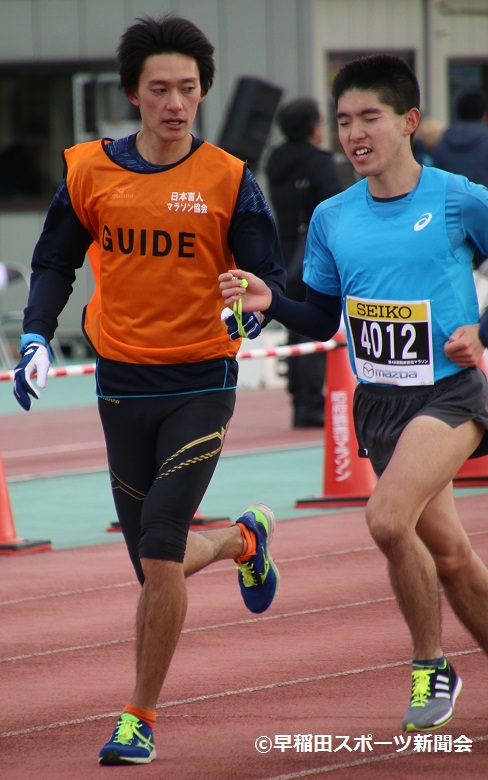 視覚障がい男子の部は、大会2週間前の福岡国際マラソンでT12クラス日本歴代2位の好記録である、2時間27分35秒をたたき出した熊谷豊選手(三井住友海上)が優勝を飾った。35キロ地点までは2大会連続の好記録が期待されるペースで走っていたものの、疲労の影響もあってかそこから失速してしまう。最後の2.195キロは8分54秒と苦しい表情を見せたが、前半の攻めの走りが生き、2時間32分12秒でフィニッシュ。福岡国際マラソンから中2週間での参加で、収穫のあるレースとなった。