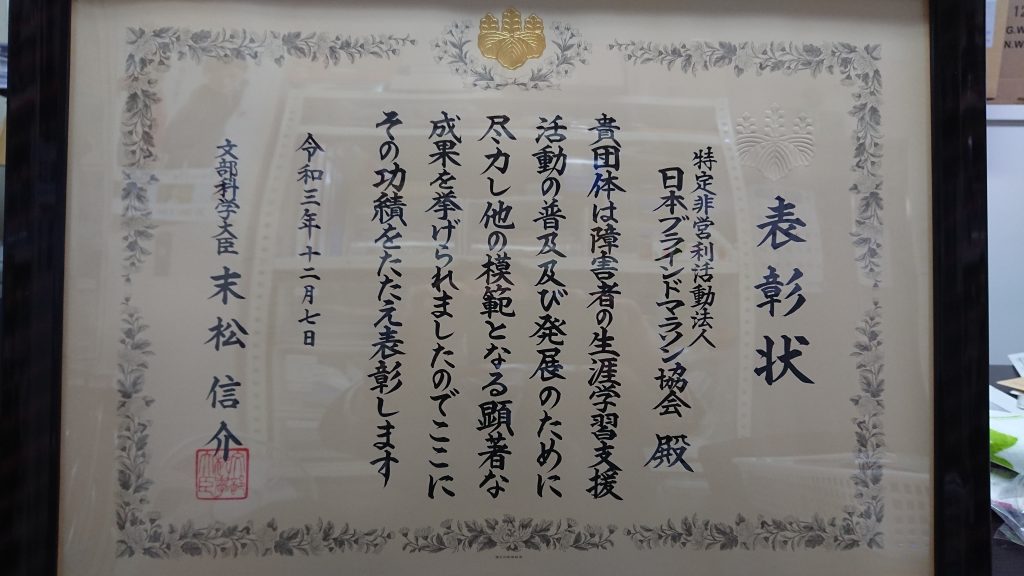 この度、日本ブラインドマラソン協会が令和3年度「障がい者の生涯学習支援活動」に係る文部科学大臣表彰を受賞しました。
