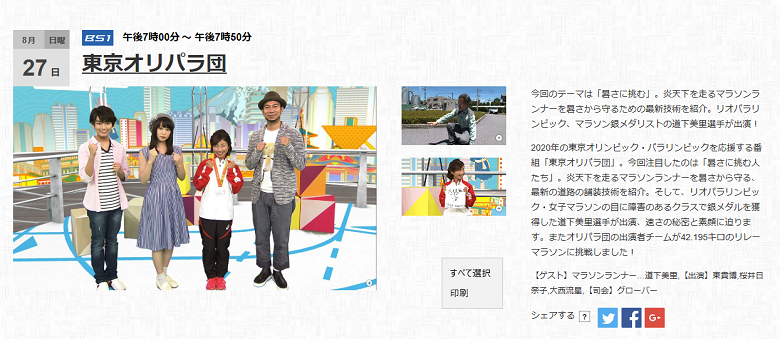 そして、リオパラリンピック・女子マラソンの目に障害のあるクラスで銀メダルを獲得した道下美里選手が出演、速さの秘密と素顔に迫ります。またオリパラ団の出演者チームが42.195キロのリレーマラソンに挑戦しました!