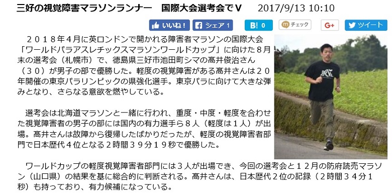 「三好の視覚障害マラソンランナー 国際大会選考会でV」