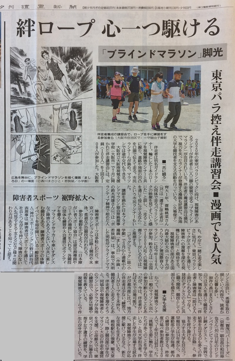 掲載紙 読売新聞 夕刊 関西版 9月9日 絆ロープ 心一つ駆ける「ブラインドマラソン」脚光 以下、紙面となります。画像なので、読み上げはできませんのでご了承ください。