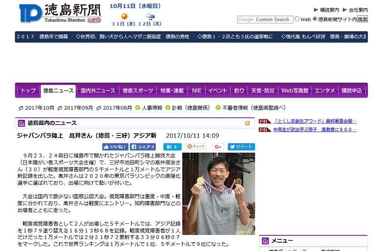 先日、福島で開催されたジャパンパラで活躍したT13クラスの高井俊治選手の活躍の様子が地元の徳島新聞で紹介されました。