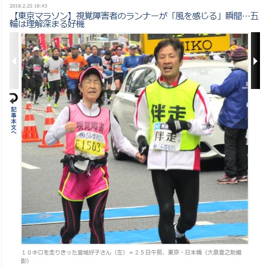 24日に開催された東京マラソンにおいて10k視覚障害の部に参加の宮城好子さんの記事が産経新聞に掲載されました。