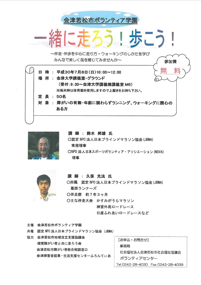 昨年に引き続き、会津若松市での研修会となります。伴走だけでなく、ランニング・ウォーキングについての研修会となります。