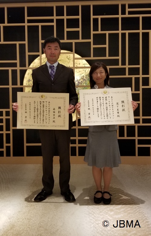 今回の顕彰・表彰において、ブラインドマラソン協会から昨年4月に行われたWorld Para Athletics(WPA)Marathon World Cupの男子T12/T11クラスで優勝した和田伸也選手、女子T12/T11クラスで優勝した道下美里選手、両選手の指導者として、安田享平コーチが顕彰を受けました。