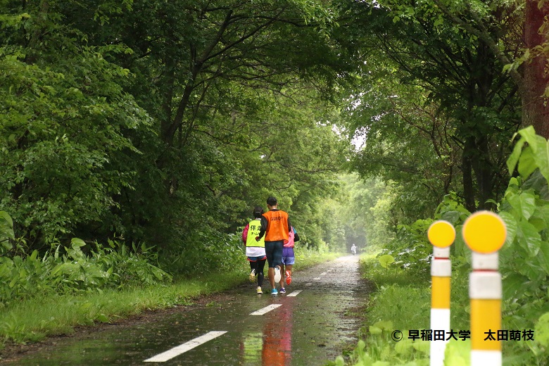 レース翌日の3日目のメニューはなんと、40~48キロの距離走だ。宿舎から車で10分ほどの能取湖の周りを囲むサイクリングロードを利用して設置された往復8キロの直線コース。ここを5~6往復する。聞くだけでも気が遠くなりそうなハードさだが、そこに拍車をかけたのがこの日の天候だった。7月にもかかわらず、最高気温が9℃という寒さに加え、しとしとと降り続ける雨が容赦なく体温を奪っていく。深い緑の木々に囲まれた湖畔のコースは、雨に濡れどこか神秘的な雰囲気さえまとう綺麗な場所だった。その中を、各々の設定ペースで走り続ける選手たち。そこにはタッタッという足音だけが響いていた。練習後寒くなかったか選手に尋ねると、走っていると丁度よかったとのこと。そういうものなのか…。