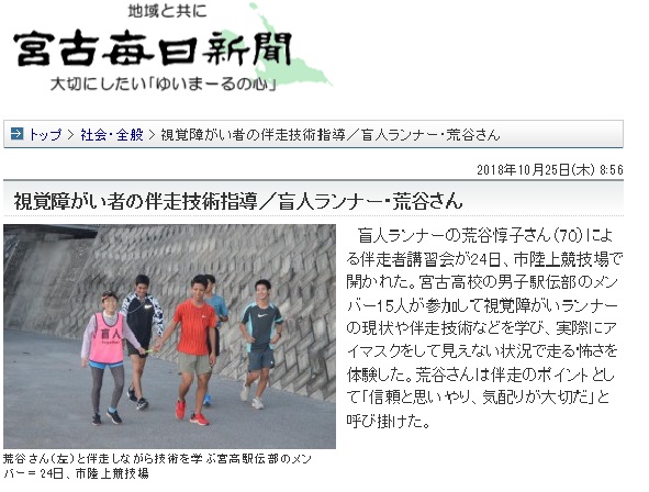 自らが視覚に障がいを持っている荒谷淳子さんが移住先の沖縄県宮古島で自分が走るための伴走講習会を行ったことが、宮古毎日新聞に掲載されました。