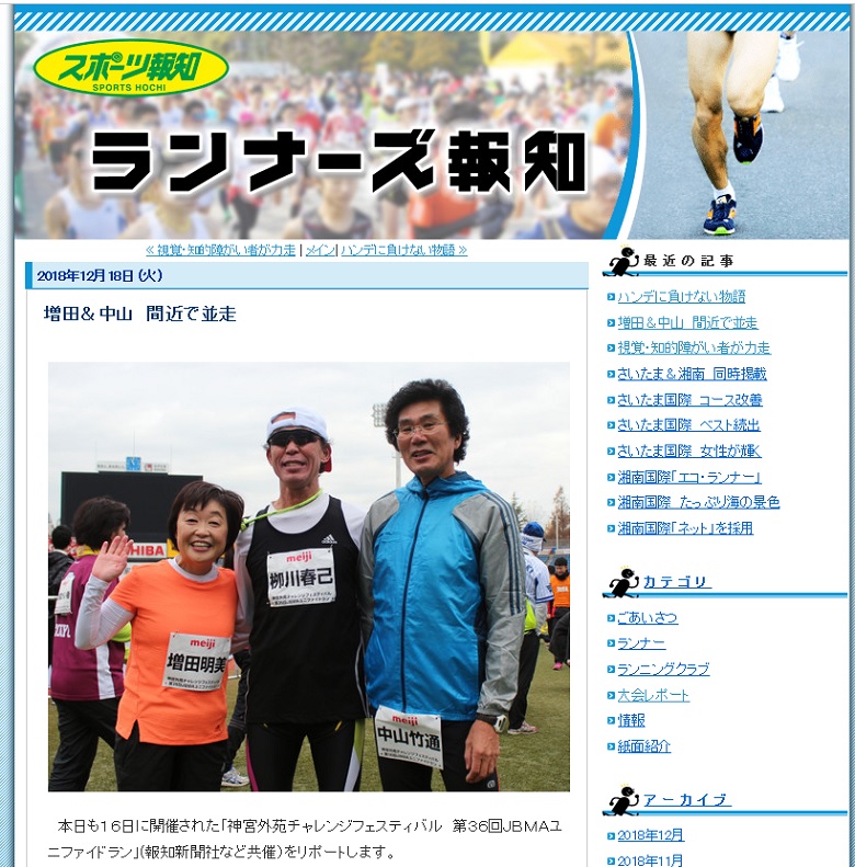12月16日に行われた「神宮外苑チャレンジフェスティバル 第36回JBMAユニファイドラン」の模様が12月20日発売のスポーツ報知「ランナーズ報知」に掲載されていますので、ぜひ、お手に取ってご覧ください。