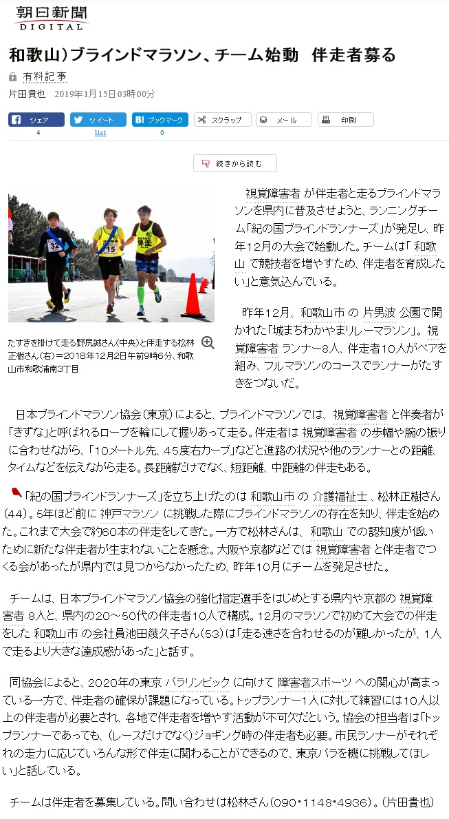 2018年10月に和歌山で発足した「紀の国ブラインドランナーズ」の様子が1月15日の朝日新聞に紹介されました。