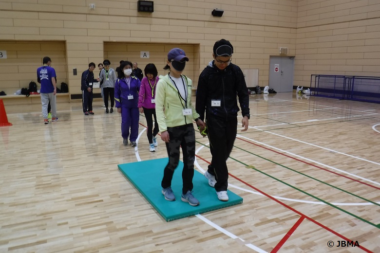 続いて後半には、体育館にて実技。アイマスクによる体験の後、実際に障害者の伴走をして頂きました。初めて伴走する受講者も多く、障害者や講師のアドバイスを受け、熱心に取り組んでおりました。