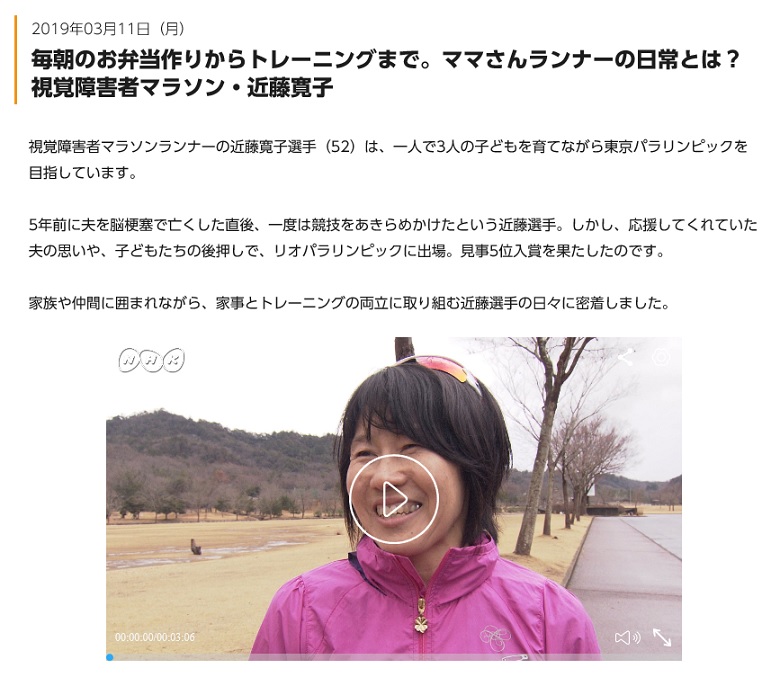 2019年1月21日の「あさイチ」で放送された近藤寛子選手のVTRを再編集したものがNHKのパラリンピック関連HPに、公開されました。
