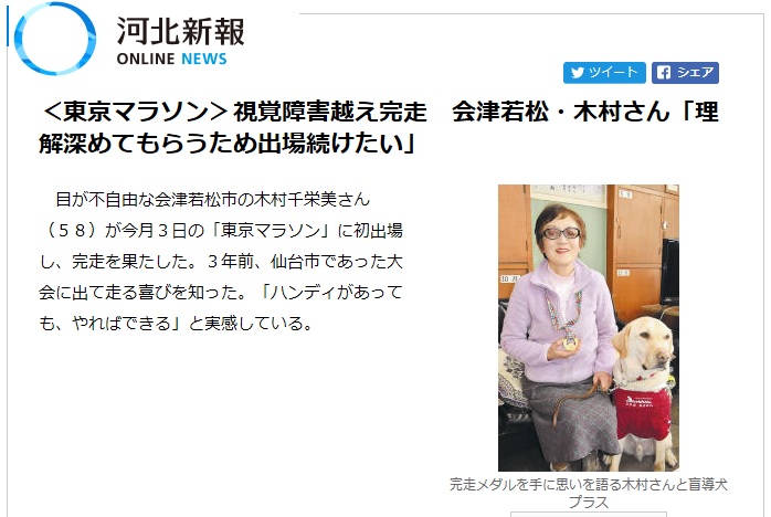 3月3日に行われた、東京マラソンの10キロ視覚障害者女子の部に参加された、会津若松市の木村千栄美さんの記事が3月17日の河北新報に掲載されました。
