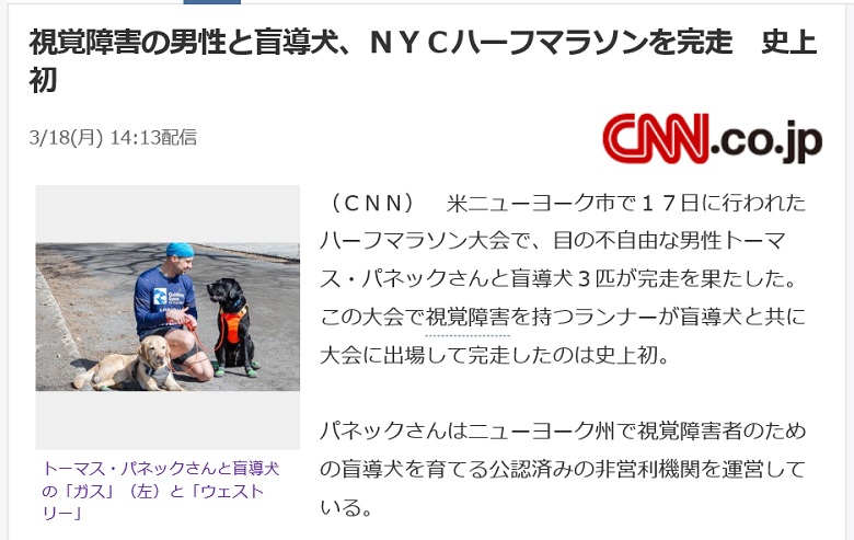 3月17日にアメリカのニューヨークで行われたニューヨークシティハーフマラソン大会に3頭の盲導犬と共に参加した、ブラインドランナーが見事に完走したという記事が掲載されています。