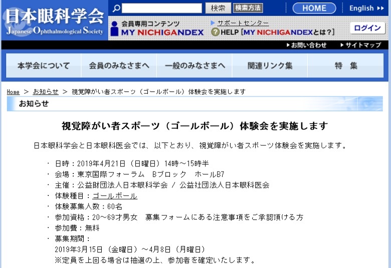 協会の参与であり、日本の視覚障がいスポーツのクラス分け第一人者である清水朋美先生が所属する日本眼科学会/日本眼科医会が主催となり、「視覚障がい者スポーツ体験会」が4月21日に東京国際フォーラムにて開催されます。