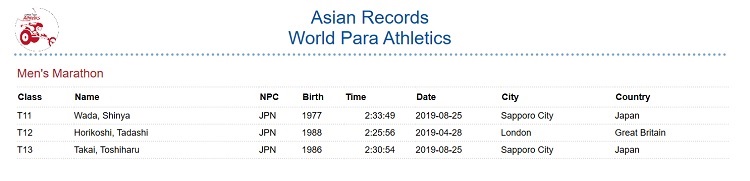 8月25日に行われた北海道マラソン2019においてマークされたT11クラス和田伸也選手の2時間33分49秒とT13クラスの高井俊治選手の2時間30分54秒がそれぞれアジア記録として公認されました。