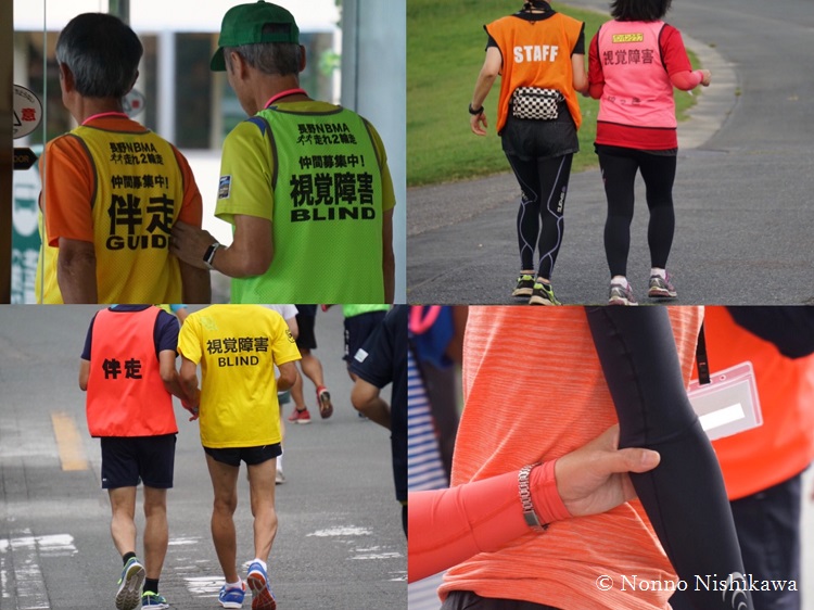 そもそもブラインドマラソンとはどのような競技なのだろうか。ブラインドマラソンとは、ブラインドランナーと伴走者が数十cmの紐またはロープを互いに持って走る競技である。伴走者はただ隣を走るというだけでなく、ブラインドランナーに他の選手の状況や周りの状況、走路の状態、タイム等を知らせたり、ブラインドランナーのペース配分や体調に変化がないか観察したりする役割を担っている。伴走者が求められていることは、ブラインドランナーと手足の動きを揃えて走ることである。伴走者はあくまでもアシスタントであるため、ブラインドランナーの手をひっぱったり、先にフィニッシュラインを通過したりする行為は反則になる。
