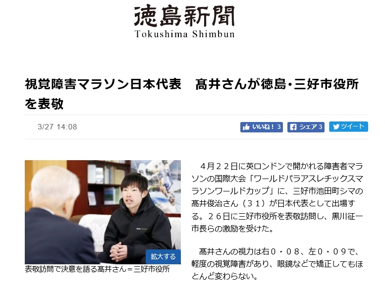 4月22日に開催されるマラソンワールドカップに向けて、地元の徳島県三好市役所を表敬訪問した様子が徳島新聞に掲載されました。