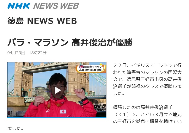 マラソンワールドカップT13クラスで優勝した高井俊治選手がNHK徳島放送にて紹介されました。