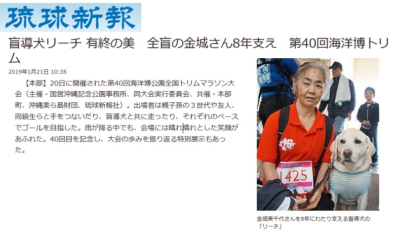 1月20日に開催された第40回海洋博公園全国トリムマラソン大会に参加されたブラインドランナーと盲導犬の様子が琉球新報に掲載されています。