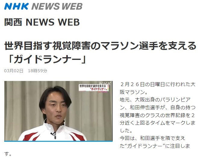NHK NEWS WEBに大阪マラソンで快走したばかりの和田伸也選手と長谷部匠ガイドが紹介されています。