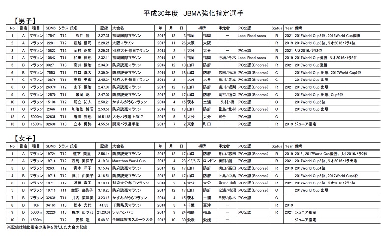 平成30年度、JSC強化事業の対象者となる、強化指定選手です。